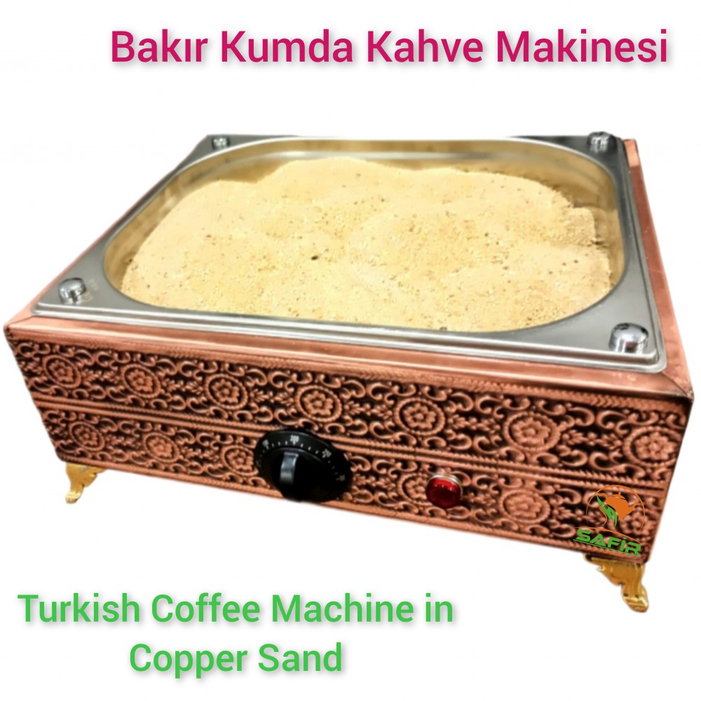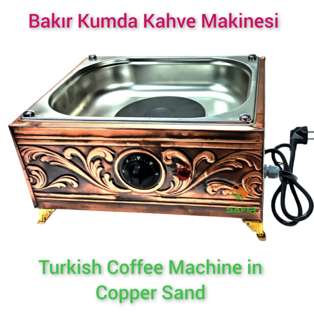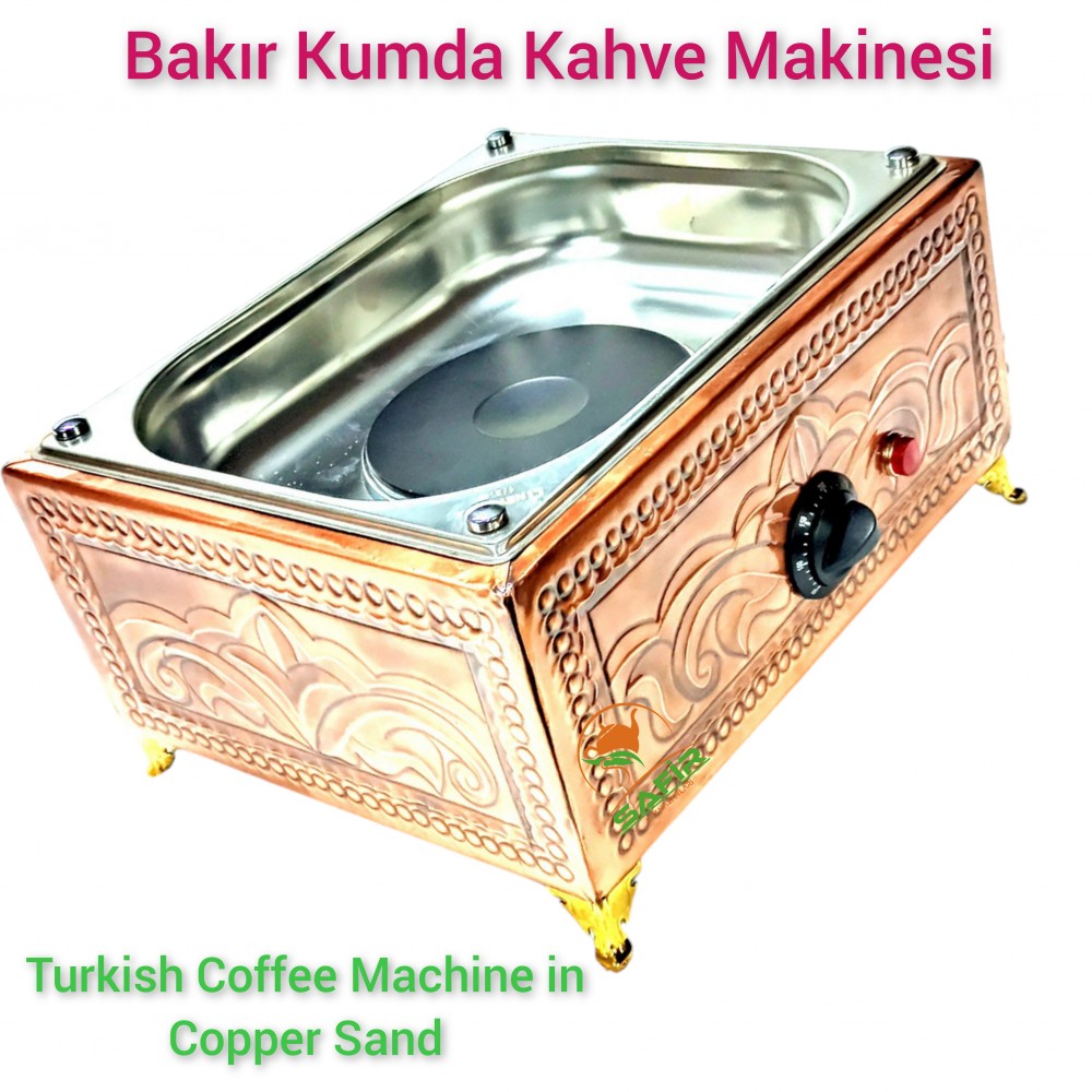 Safir Kumda Kahve Makinesi Kafe, restoran veya kahvehanenizde aynı anda birden fazla kumda Türk kahvesi hazırlamak istiyorsanız, 4 cezvelik bakır kumda kahve makinesi tam size göre bir üründür. 35x28 cm ölçüleriyle geniş pişirme alanı sunan bu profesyonel kumda kahve makinesi, 2000W elektrikli pleyt sistemiyle yüksek performanslı ve kesintisiz kahve servisi sağlar.