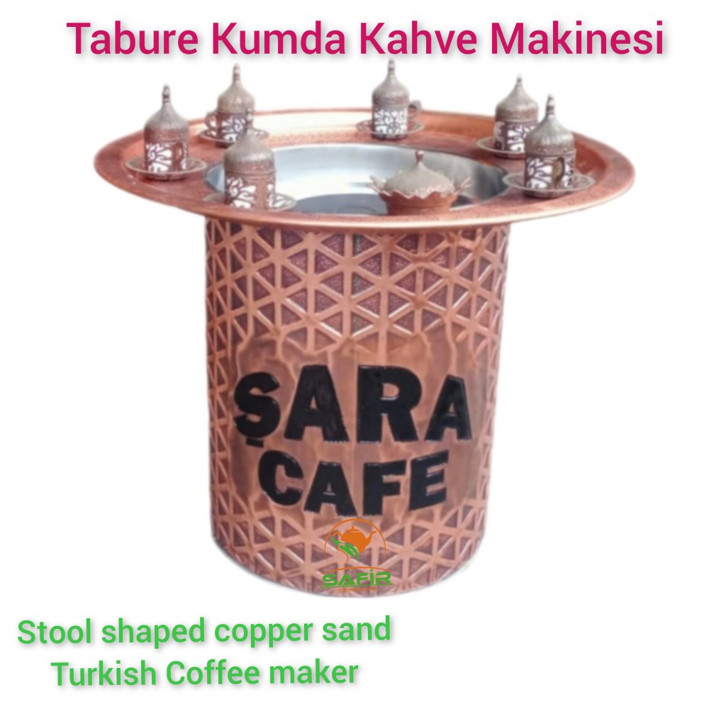 üretim ekibimiz tarafından özenle imal edilen Safir Tabure Tepsili bakır kumda kahve